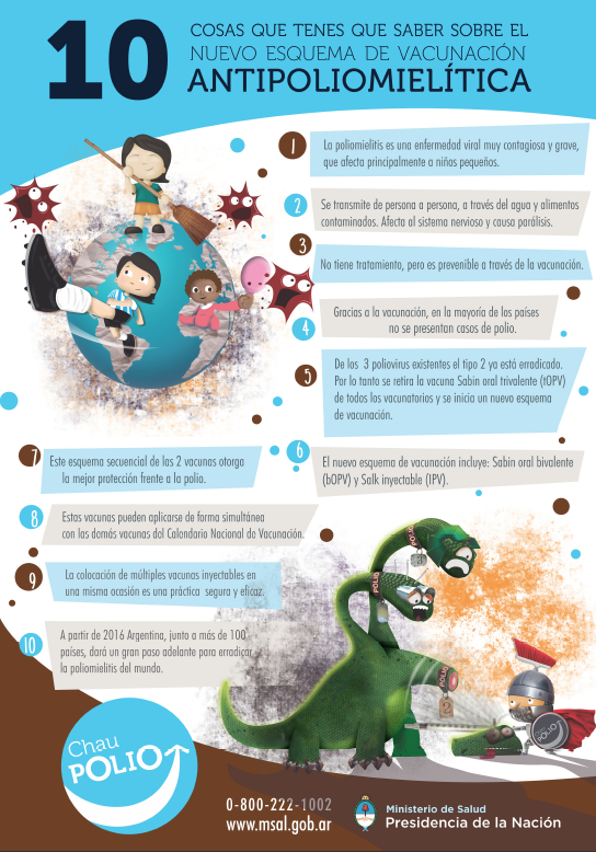 Argentina, junto con otros 122 países, hará un cambio sincronizado en el esquema de vacunación: se reemplazará la vacuna Sabin oral trivalente, por la Sabin oral bivalente (que protege contra polio 1 y 3) y se incorporará la vacuna inyectable Salk, que es trivalente (asegurando la protección contra la polio luego del cambio).